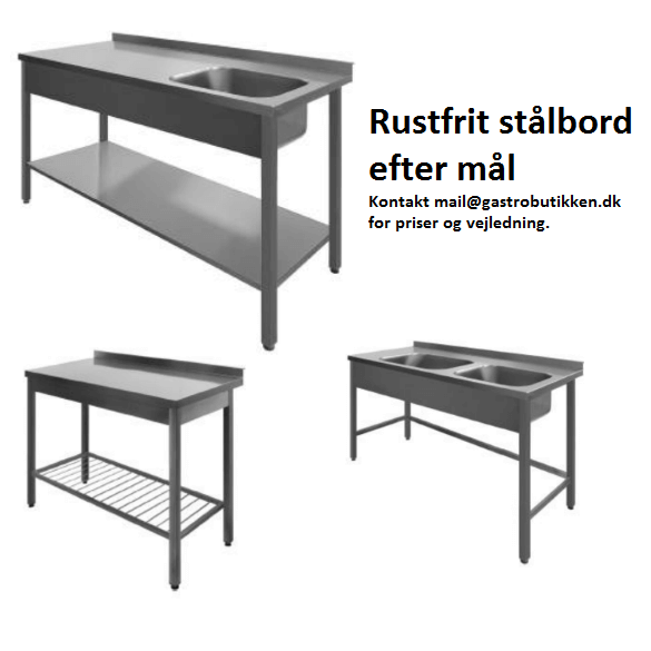 Send en email til mail@gastrobutikken.dk med bredde x dybde x højde, ønske om håndvask og placering, underhylde – alm. eller rippet – osv. Du har et uforpligtigende tilbud inde for 24 timer.tilbud inde for 24 timer.