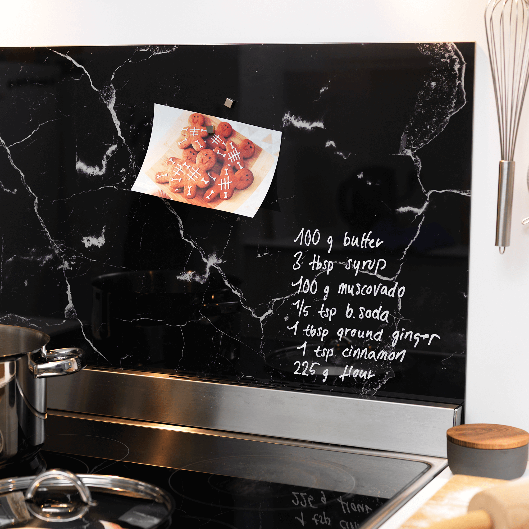 Magnetisk stænkplade i hærdet glas. 60 x 50 cm. med sort marmorprint.