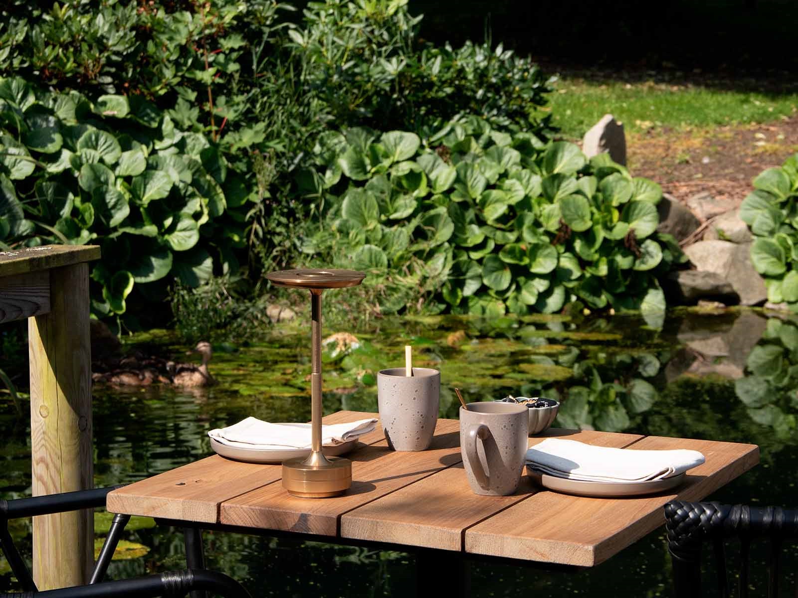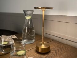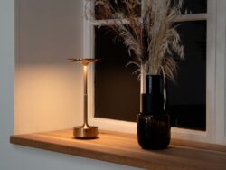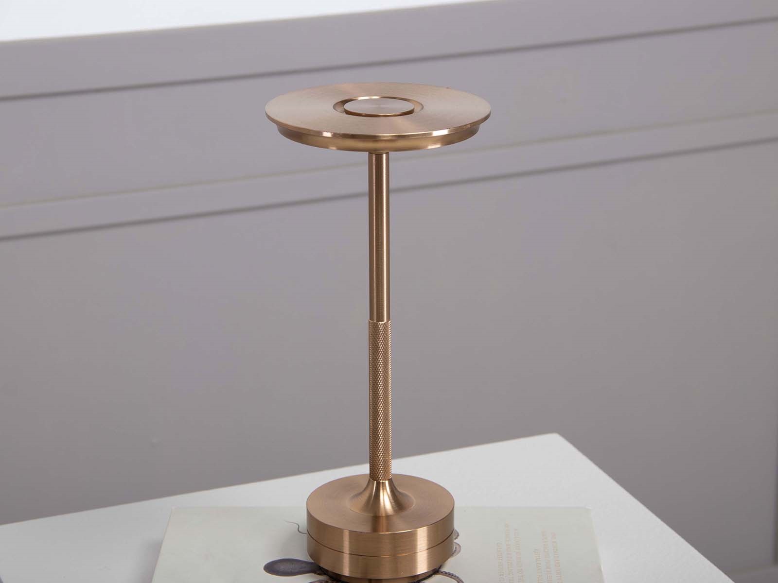 Denne smukke Ava LED lampe er udført i guldfarvet aluminium, som gør den stilren og tidsløs. Den er perfekt til både indendørs og udendørs belysning, da den er nem at transportere, og har en gummibelægning under bunden, som ikke ridser overflader.
