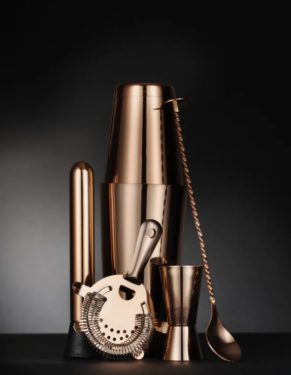 Bar‑værktøjerne i sættet er fremstillet af rustfrit stål med en kobberfarvet belægning, som giver både et eksklusivt udtryk og en robust kvalitet, der tåler daglig brug. De inkluderede elementer dækker de vigtigste opgaver i cocktailtilberedning: