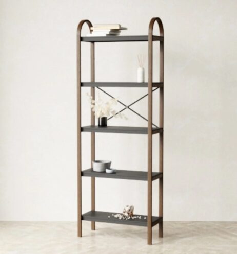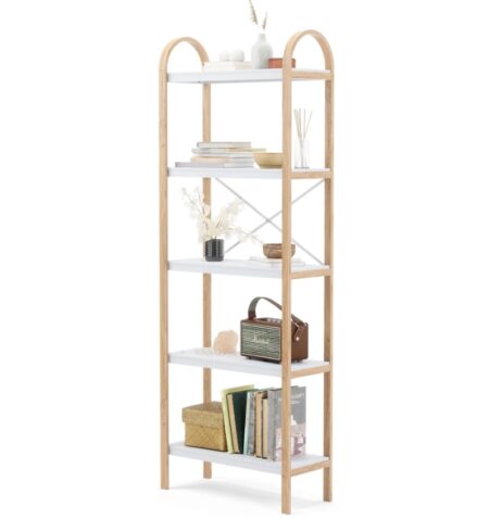 Bløde kurver: Denne moderne fritstående hylde har fem hylder med buede bøjede accenter; hver hylde kan rumme 29 lbs (13 kg)