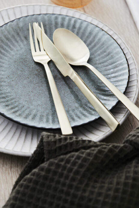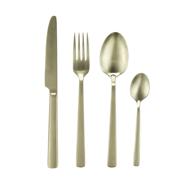 Flot bestiksæt med 16 dele fra Bahne Interior. Bestikket er fremstillet af rustfrit stål i guld, og har et satinlignende matt finish.