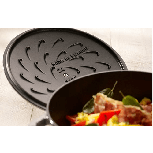 En nyhed i produktsortimentet: STAUB braisergryde lavet af emaljeret støbejern. Den alsidige og kompakte braisergryde giver fremragende madlavningsresultater takket være lågets specielle ‘piggede’ Chistera drop-struktur.