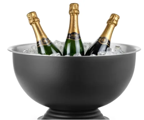 Den brede åbning gør det nemt at fylde is og flasker i skålen, mens det enkle design passer ind i enhver borddækning eller baropstilling.
