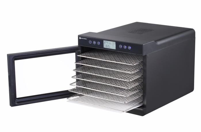 Dehydrator fra Hendi til tørring af urter, grøntsager, kød, fisk mm. Cirkulerer automatisk, så man opnår en jævn tørring. Der medfølger 7 hylder i rustfrit stål, som kan holde op til 500 g. pr hylde. Hylderne kan nemt tages ud og rengøres. Dehydratoren har dobbelvæge, der sikrer en bedre tørring. Den klare låge sikrer, at man hele tiden kan holde øje med sine madvarer under tørringen. Digitalt display hvor tempratur kan justeres fra 35 til 70 grader. Maskinens timer kan indstilles fra 30 min op til 24 timer, med 30 minutters intervaller.