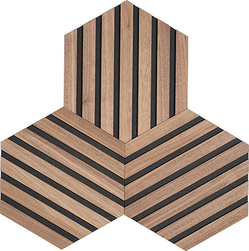 Acupanels smukke og dekorative Hexagoner er en del af vores non-acoustic linje. Brug Heksagonerne på væggen som en smuk dekorativ løsning. Du kan mikse vores forskellige træsorter, så du får lige det design, du ønsker.