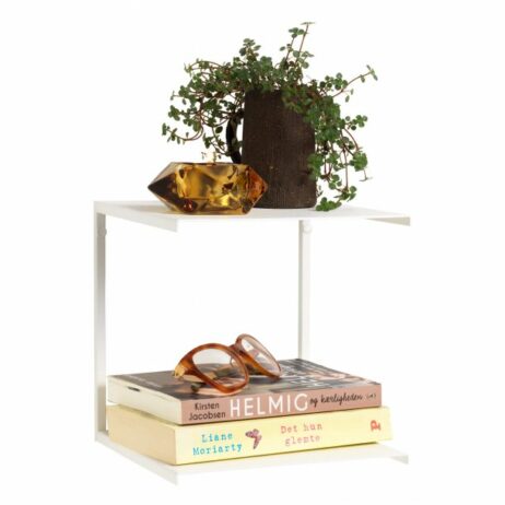 Hylden måler 20 x 20 x 20 cm, har 2 hylde flader og er fremstillet i hvidmalet metal.