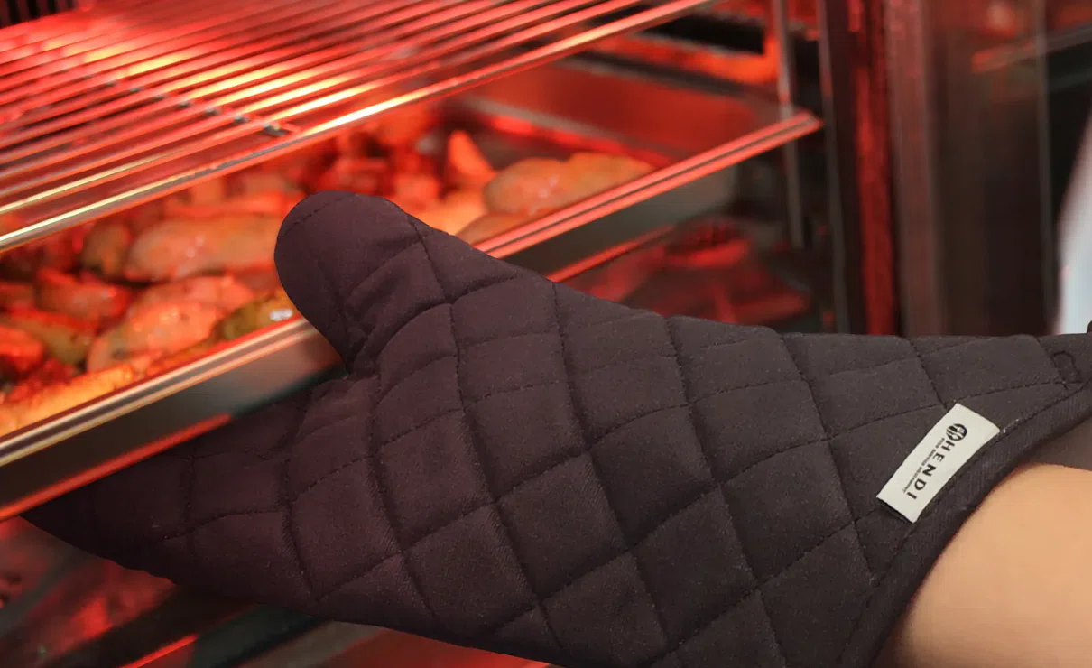 Den lange manchet gør det nemt at arbejde sikkert ved dybe ovne eller varme maskiner, mens den fleksible pasform giver god bevægelsesfrihed og et stabilt greb om køkkenudstyret.
