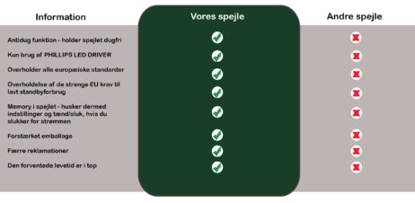 – Anti korrosions behandling – for lang holdbarhed (vigtigt for badeværelsesspejle).