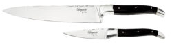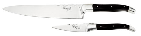 Dette chefsæt fra Laguiole By Hâws består af to essentielle knive, fremstillet af 420 rustfrit stål og mærket med det klassiske cikade-logo – et symbol på kvalitet og håndværk. Håndtagene er udført i elegant sort træ, som giver et stilrent og tidløst udtryk.