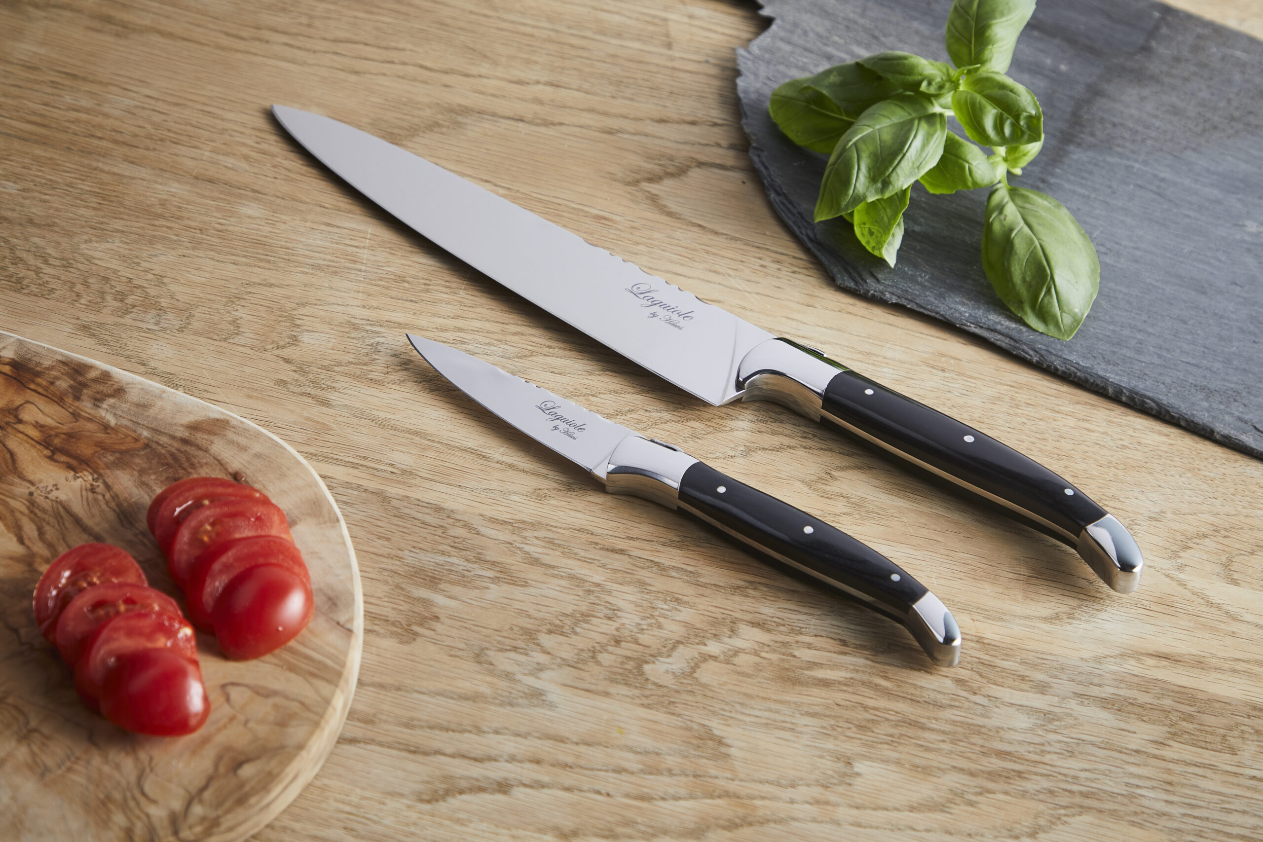 Uanset om du opbevarer knivene på en magnetisk knivholder eller i en knivblok, fremstår de smukt med deres sorte håndtag og eksklusive finish.