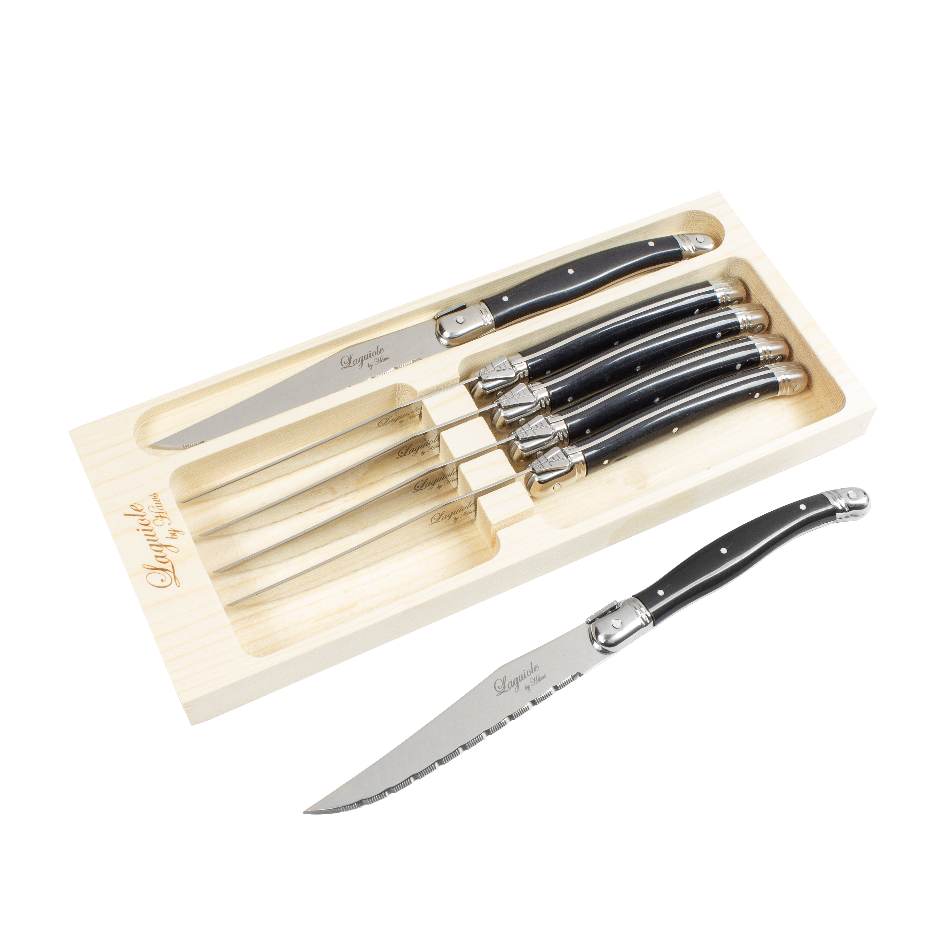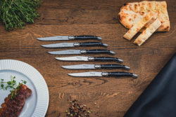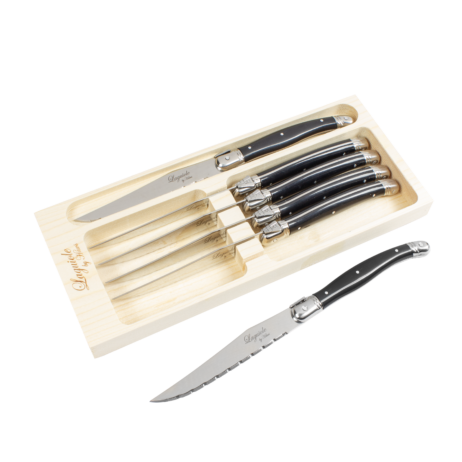 Tilføj stil og skarphed til middagsbordet med disse elegante Laguiole steakknive i et moderne sort look. Laguiole er ikke et brand, men en traditionsrig knivform fra 1800-tallets Frankrig – kendt for sit ikoniske design og høje kvalitet.
