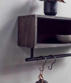 Dette multifunktionelle møbel består af to vigtige komponenter: Chelsea-hylden i træ og en robust jernbarre. Du kan montere jernbaren under hylden ved hjælp af de medfølgende skruer eller vælge at hænge den på væggen ved hjælp af dine egne skruer for at tilpasse det efter dine behov.