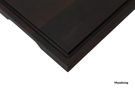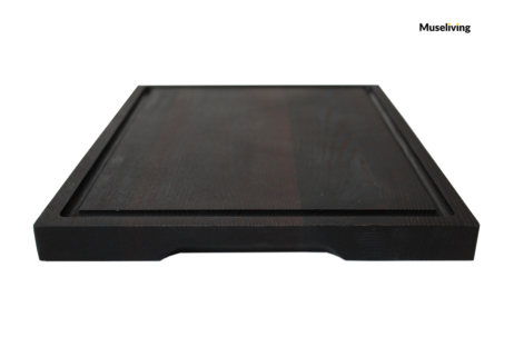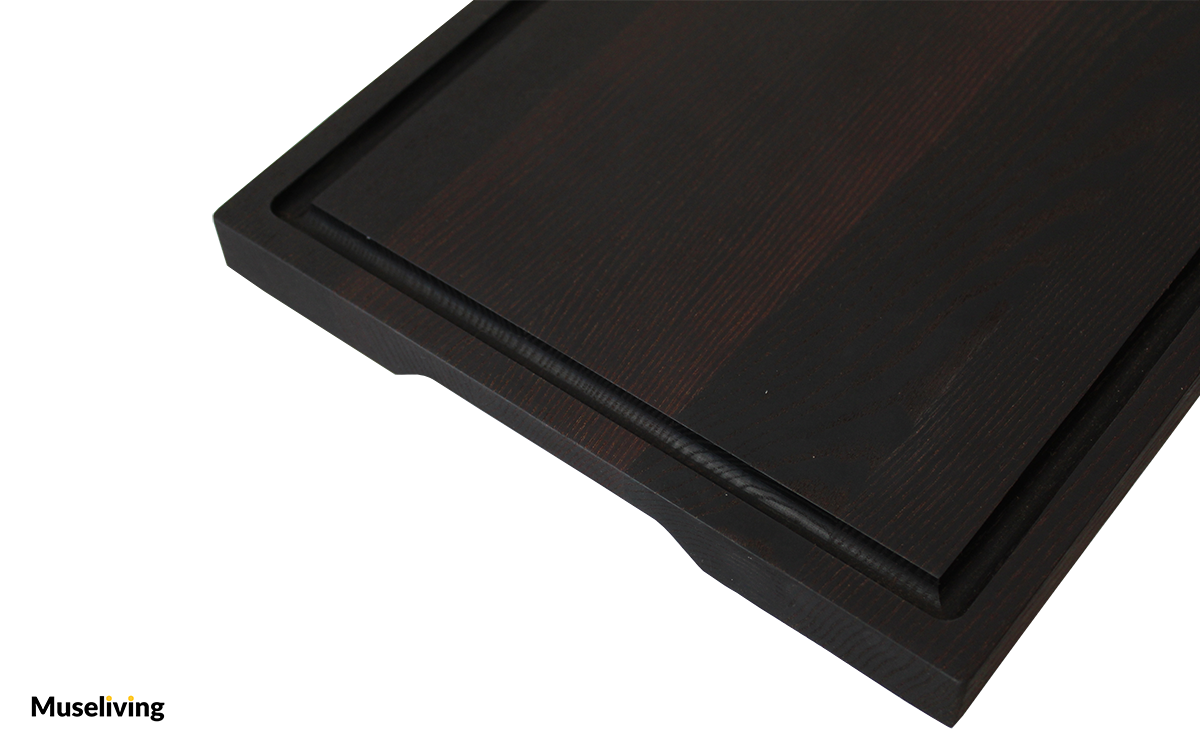 Materiale: Skærebrættet er lavet af termisk behandlet aske træ, der giver det en karakteristisk mørk farvetone med dybe brune og sorte nuancer. Denne farvevariation tilføjer en naturlig og rustik fornemmelse til køkkenet.