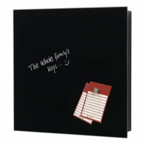 På skabets sorte glasforside kan du desuden skrive beskeder, tegne en smiley eller invitere gæsterne velkommen med en lille hilsen. Du kan nemlig skrive på glasset med kridtmarkers eller almindelige whiteboard markers. Når tuschen er tør kan den nemt viskes ud gen med en tavlesvamp eller tør klud. Til grundigere rengøring skal du bruge tavle rens eller almindelig glas rens og en blød klud som ikke ridser glasset.