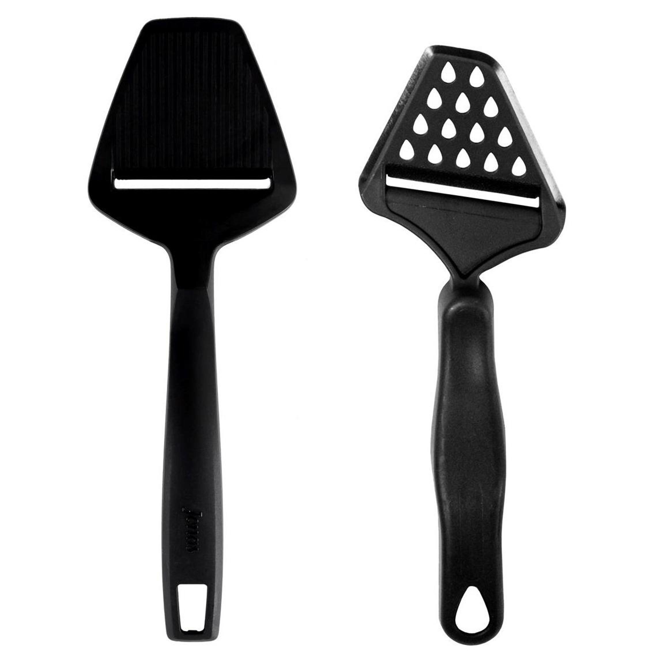 Sæt med 2 sorte ostehøvle med hul til ophæng. De kan anvendes til flere typer skæreoste, da de er stærkere end osteskærere med streng.