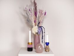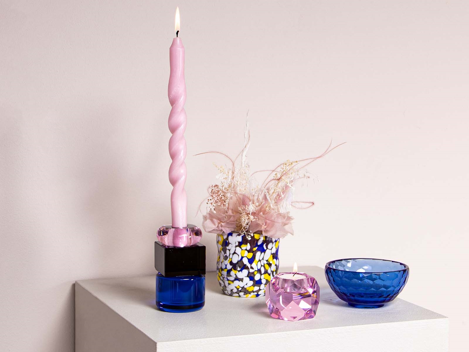 Petunia lysestagen er en smuk, håndlavet lysestage skabt af massivt gennemfarvet glas i farverne blå, sort og lyserød. Den håndlavede lysestage er designet med fokus på at skabe unikke former og en harmonisk farvekombination. Dette giver Petunia mulighed for at stråle med sin egen skønhed og samtidig harmonere sammen med et bredt udvalg af lysestager. Petunia er 11,5 cm i højden og beregnet til stagelys.
