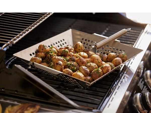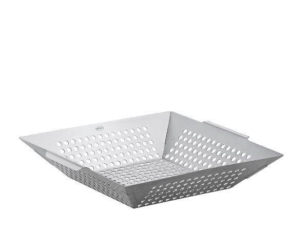 Grillbakken er ideel til grillning af skårne grøntsager, frugt eller kød og til tilberedning af varme kastanjer. Lavet af perforeret rustfri stålplade til direkte varmeoverførsel til den mad, der skal grilles. To håndtag giver et sikkert greb med grillhandsker. Til brug på grillen og i ovnen.