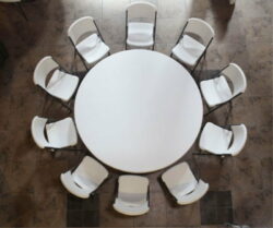 Klapbordet er designet med en hvid bordplade og har en diameter på 183 cm. På trods af sin rummelige størrelse vejer det kun 30 kg, men det er alligevel i stand til at bære en imponerende vægt på op til 771 kg. Det er en alsidig løsning, der især passer godt til forsamlingshuse, sportshaller og eventsteder, hvor der ofte er brug for fleksible og holdbare møbler.