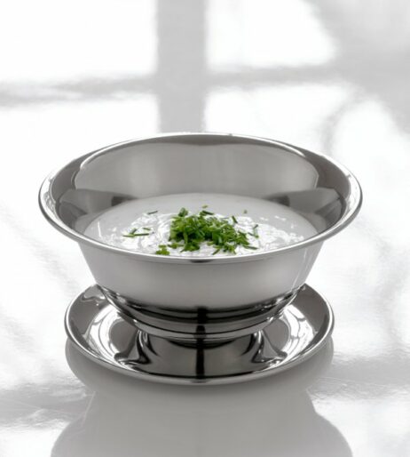 Flot klassisk sauceskål i blankt stål. Sauceskålen er velegnet til servering af saucer og supper. Tåler maskinopvask. Kan rumme 0,5 litter Mål: 14 x 7 cm