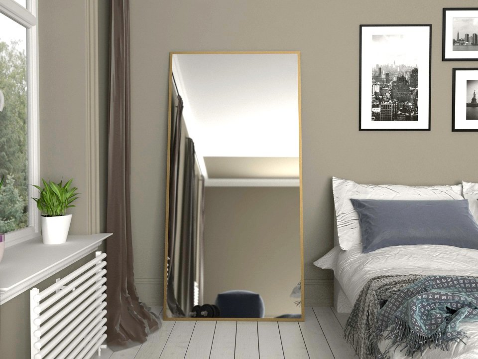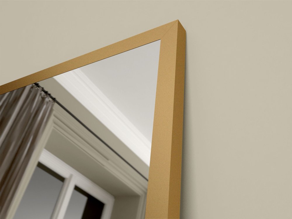 Dette elegante firkantede spejl måler 170 x 70 cm og er indrammet i en slank, guldfarvet aluminiumsramme.