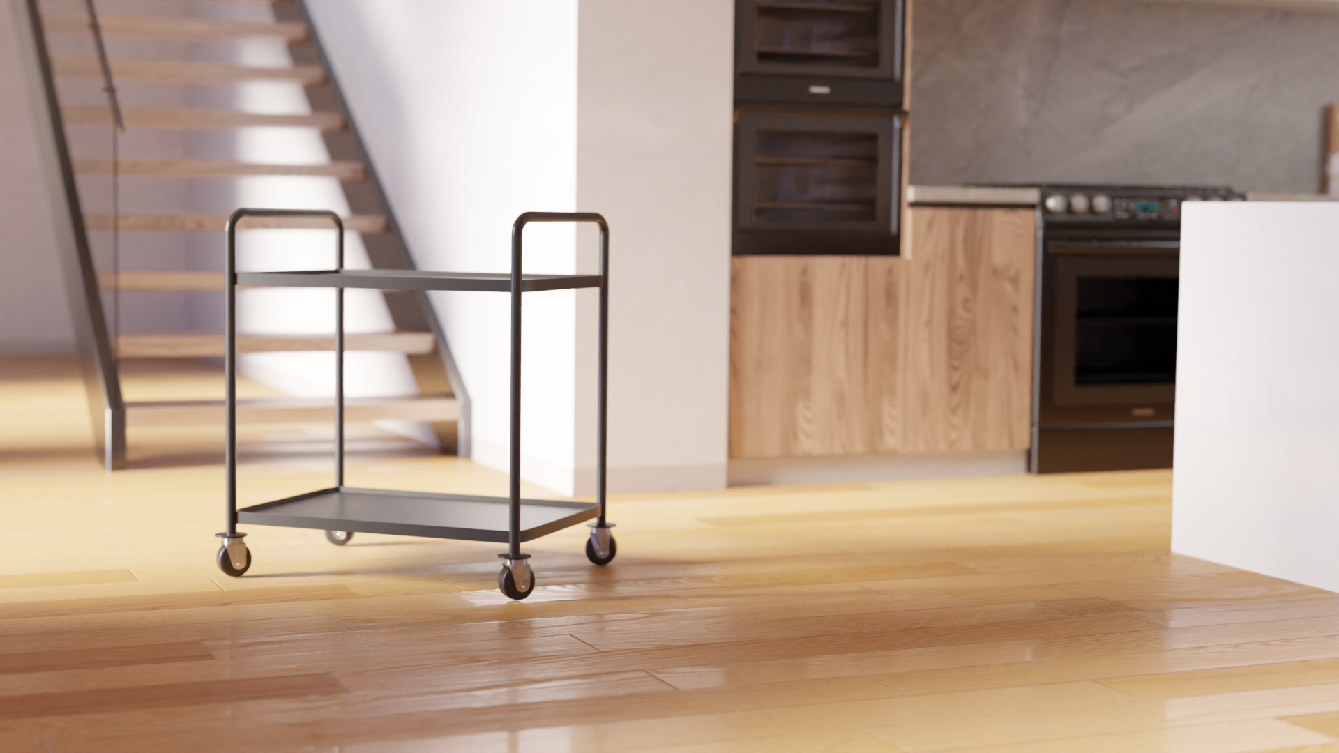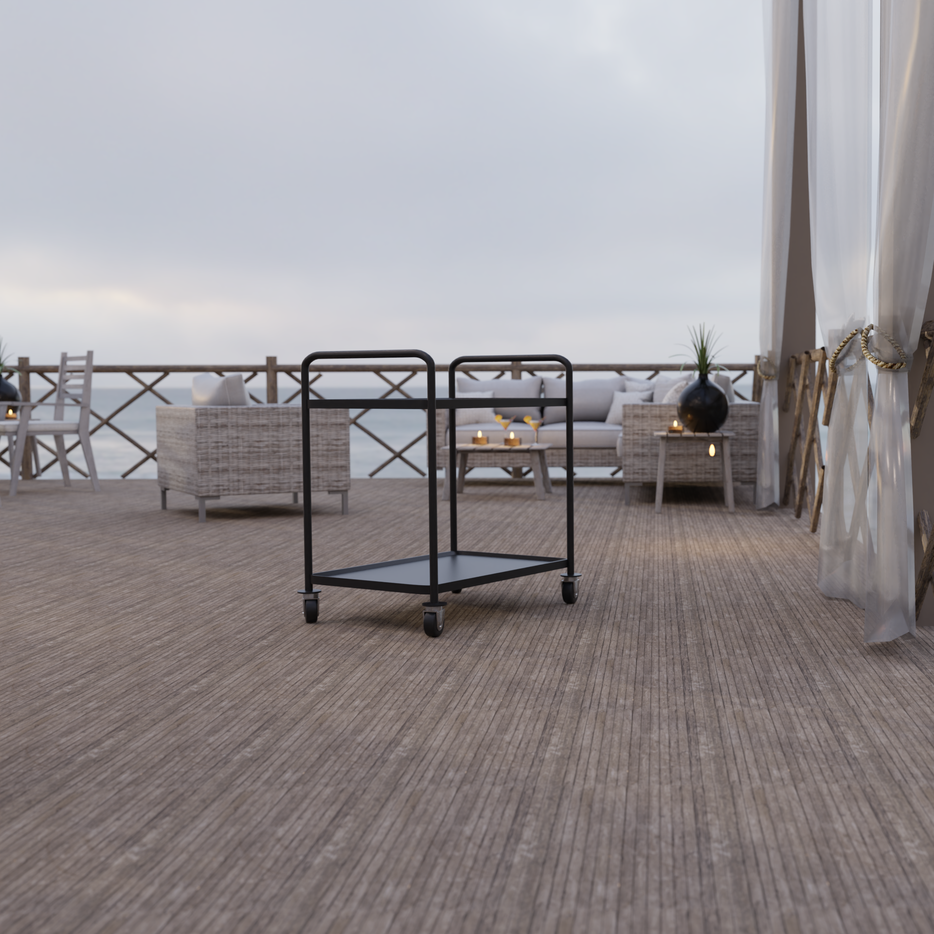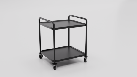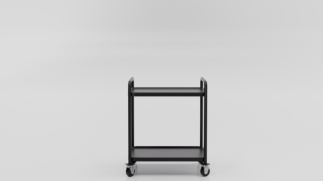 Sort rullebord med 2 hylder. Kan bruges som hjemmebar, og nemt indgå som en del af indretningen.