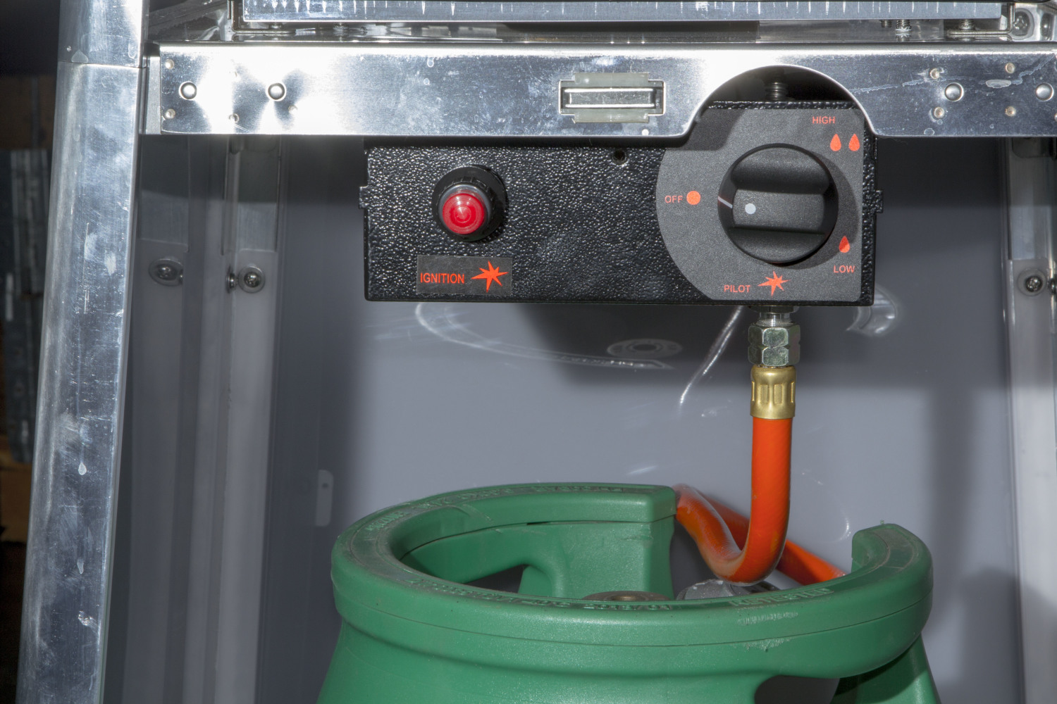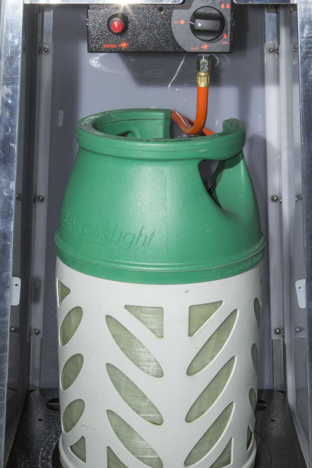Terrassevarmeren er designet til at fungere med propan eller butangas og leveres med en benzintank, der passer i bunden. Den inkluderer også elektronisk tænding, en gasslange og en trykregulator, der sikrer nem og sikker betjening.