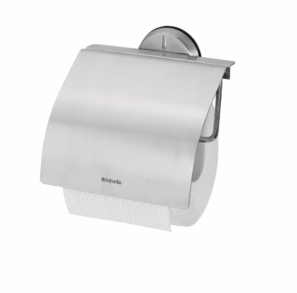 Toriletrulleholder fra Brabantia i blank rustfri stål. Holderen matcher Brabantia toiletbørste og pedalspand.