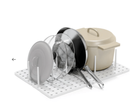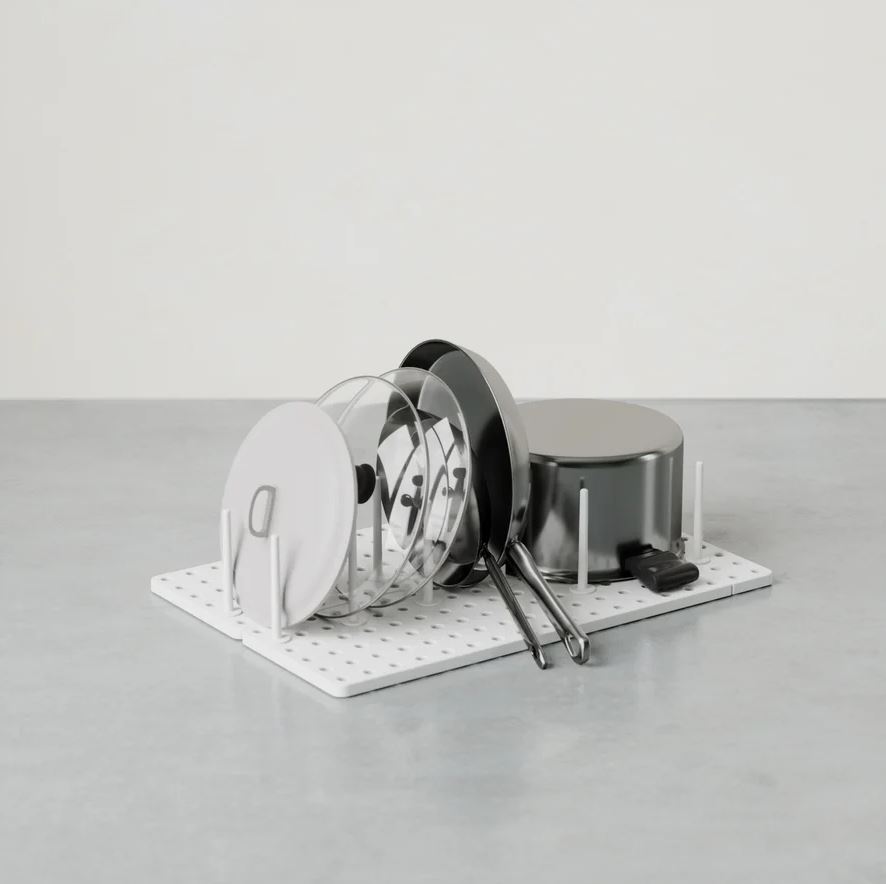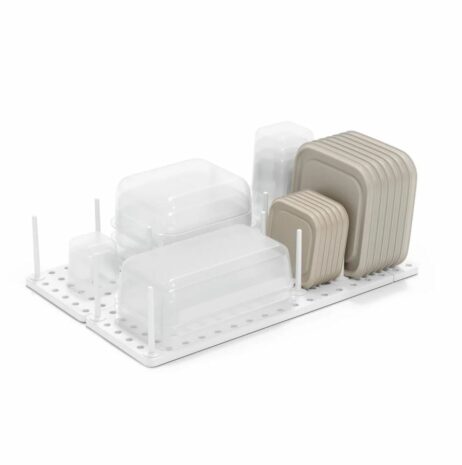 Peggy er en unik og justerbar organizer, designet med en smart bakke og flytbare pinde, som kan placeres, hvor du har brug for dem. Dette betyder, at du kan tilpasse organiseringen helt efter dine behov og skabe den ideelle opbevaringsplads til alt fra plastbeholdere og låg, til gryder, pander, skåle og køkkenredskaber.