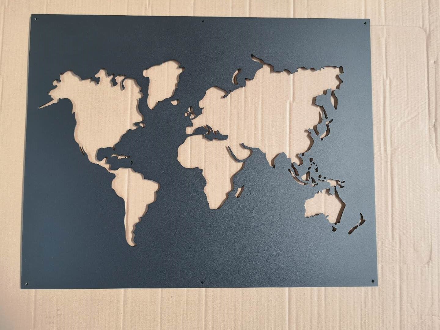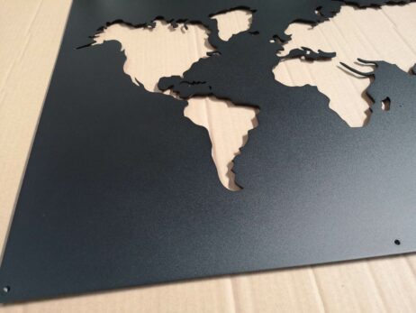 Dette verdenskort er lavet i stål og er sort pulverlarkeret.